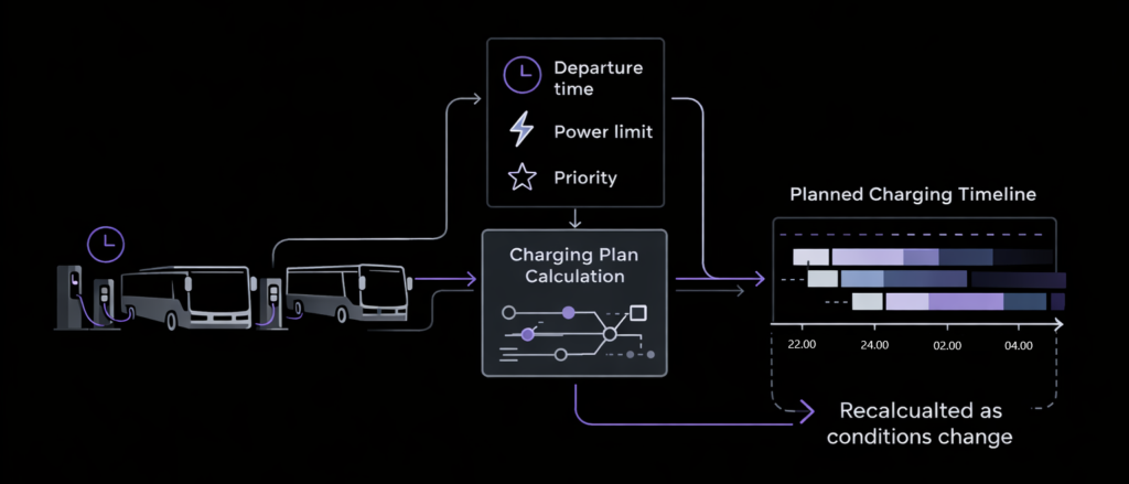 Ladepreferanser og effektgrenser defineres på depot-, ladegruppe- eller kjøretøynivå. Når kjøretøyene kobler seg til, beregner Tenix Charge individuelle ladeplaner og beregner dem kontinuerlig på nytt som svar på endringer, for eksempel kjøretøyenes ankomsttider, oppdaterte prioriteringer eller strømtilgjengelighet. Dashbord gir oversikt over planlagt og aktiv lading, slik at operatørene kan gripe inn når det er nødvendig.